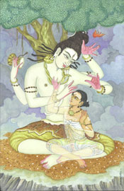 | Evitando pensamientos que distraen, ascendiendo el camino de kundalini, en busca del Creador que todo lo creó, Aquel que es hermosa luz, alcanzando la luna mística en unión, él se hará uno con el Ser que no fué creado. Eso, en verdad, es la tranquilidad de samadhi. |